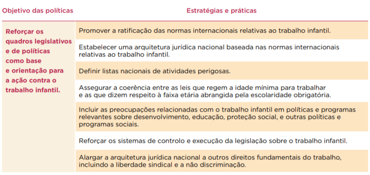 A legislação, por si só, não consegue erradicar o trabalho infantil. No entanto, é igualmente impossível eliminar o trabalho infantil sem legislação eficaz e adequada. Um quadro legislativo sólido oferece muitos contributos para os esforços contra o trabalho infantil: traduz os objetivos e princípios das normas internacionais em direito nacional, articula e formaliza o dever do Estado de proteção das crianças, estabelece direitos e responsabilidades específicos, prevê sanções para infratores e proporciona reparação legal às vítimas. Fundamentalmente, o compromisso de proteger as crianças do trabalho infantil, que pode ser estabelecido através da legislação, está também fortemente ligado a progressos concretos na redução do trabalho infantil. Na verdade, um dos resultados mais expressivos e encorajadores de um recente estudo que abrangeu 48 países sobre as tendências do trabalho infantil é a forte correlação entre a ratificação das normas internacionais e redução da incidência do trabalho infantil.11