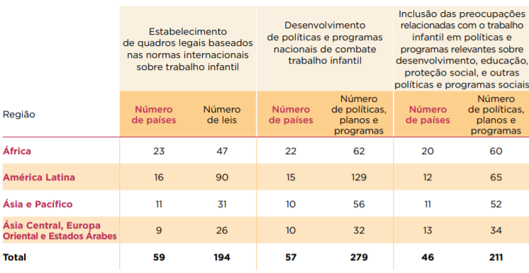 O primeiro passo é transpor essas normas internacionais para as leis e políticas concretas nacionais. Uma simples enumeração das leis e políticas aprovadas em cada país dá uma imagem dos progressos realizados (quadro 1). Durante o período de 2004 a 2014, 59 países desenvolveram, reviram ou atualizaram o seu quadro legislativo a nível nacional e subnacional, abrangendo um total de 194 leis. Cinquenta e sete países adotaram e implementaram 279 políticas, planos e programas específicos destinados a combater o trabalho infantil ou as piores formas de trabalho infantil. No mesmo período, de 2004 a 2014, a OIT registou a inclusão de preocupações com o trabalho infantil em políticas e programas relevantes sobre desenvolvimento, educação, proteção social, e outras políticas e programas